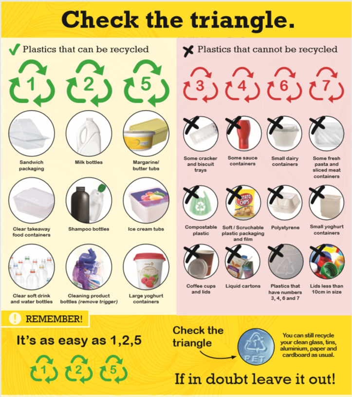 Check the triangle when shopping – choose packaging displaying the numbers 1, 2 & 5. If in doubt, leave it out of your shopping or find an alternative. Have a look at some of the videos below for more recycling and waste minimisation tips.