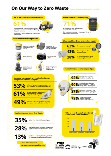 The results are in for the On Our Way to Zero Waste survey that was carried out during the month of May. Thanks to all 1175 of you who responded and gave us your thoughts and feedback! The survey aimed to understand attitudes, awareness, and behaviours regarding waste, as well as the barriers and motivations you face in minimising waste. Below you will find an overview of the results. If you're interested in learning more please please read our summary report. If you still find you have any questions or want to see more detailed reports please contact us at contact@zerowastetaranaki.org.nz and we'd be more than happy to help!